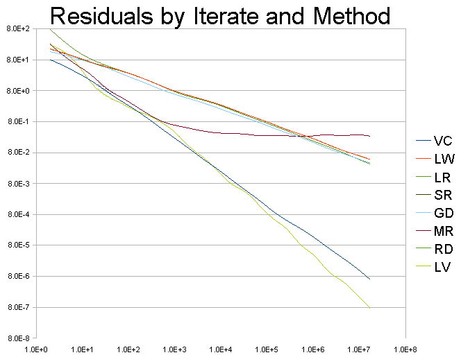 With the sole exception of the MR method, all the other solutions appear to be continuing to improve with increasing iterations at the time the experiment was stopped. This suggests that further iterations may result in further improvement in the solution. However, as this is a log-log graph, the improvement is asymptotic so it is impractical to obtain significant improvement.